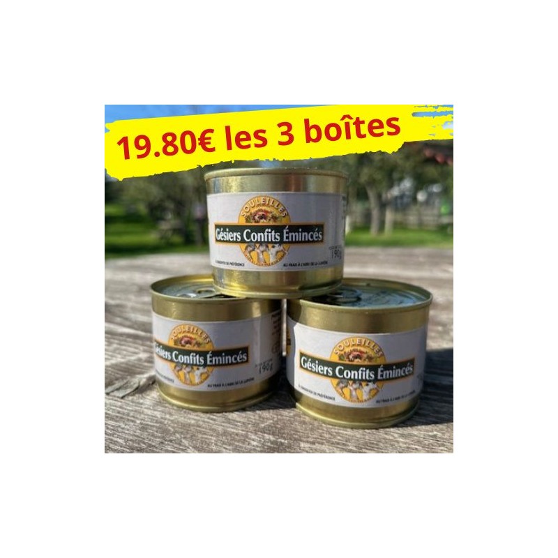 Ingrédients : Gésiers de canard 50%, graisse de canard, sel, poivre.